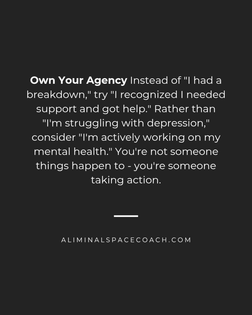 Own Your Agency Instead of “I had a breakdown,” try “I recognized I needed support and got help.” Rather than “I’m struggling with depression,” consider “I’m actively working on my mental health.” You’re not someone things happen to – you’re someone taking action.