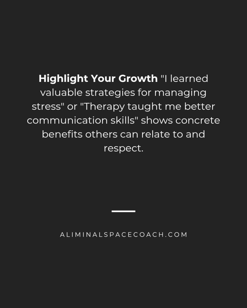 Highlight Your Growth “I learned valuable strategies for managing stress” or “Therapy taught me better communication skills” shows concrete benefits others can relate to and respect.