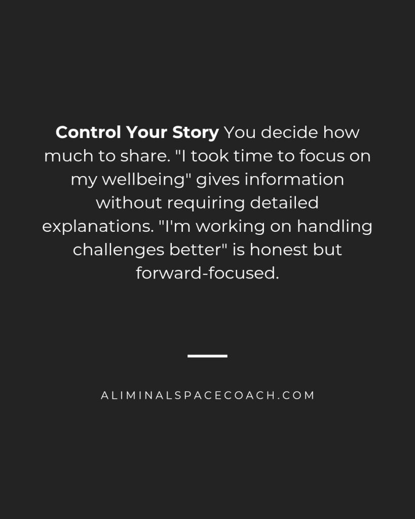 Control Your Story You decide how much to share. “I took time to focus on my wellbeing” gives information without requiring detailed explanations. “I’m working on handling challenges better” is honest but forward-focused.