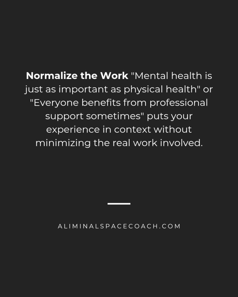 Normalize the Work “Mental health is just as important as physical health” or “Everyone benefits from professional support sometimes” puts your experience in context without minimizing the real work involved.