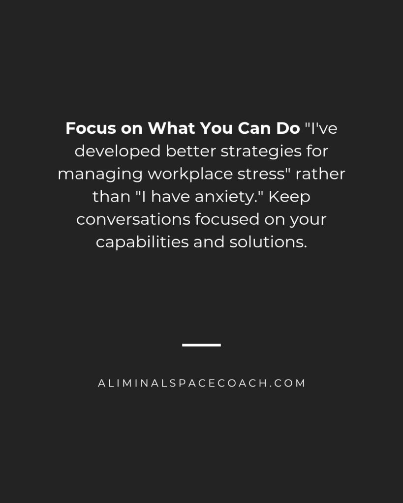 Focus on What You Can Do “I’ve developed better strategies for managing workplace stress” rather than “I have anxiety.” Keep conversations focused on your capabilities and solutions.