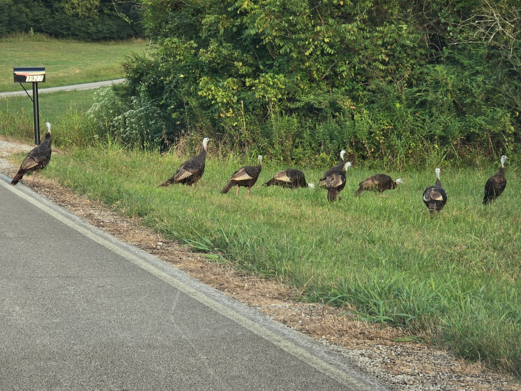 Yesterday, we watched a flock of turkeys walking up and down the road, jumping, flapping, and following each other up and down the same section of road back and forth, heading nowhere. But clearly one of the turkeys thought that was a good idea, and the others followed suit. Later I observed them huddled together in the middle of the field like they were planning their next move. I’m sure it wasn’t that much of an intellectual decision.