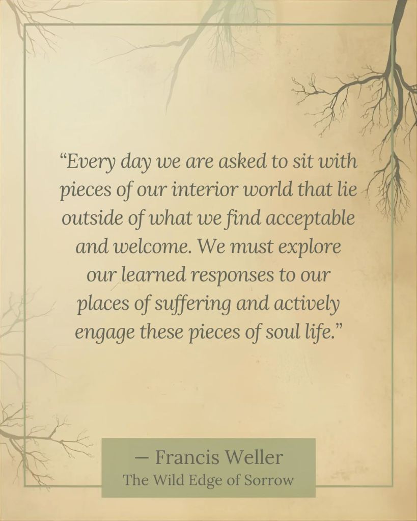 Francis Weller in his book The Wild Edge of Sorrow says, Every day we are asked to sit with pieces of our interior world that lie outside of what we find acceptable and welcome. We must explore our learned responses to our places of suffering and actively engage these pieces of soul life.